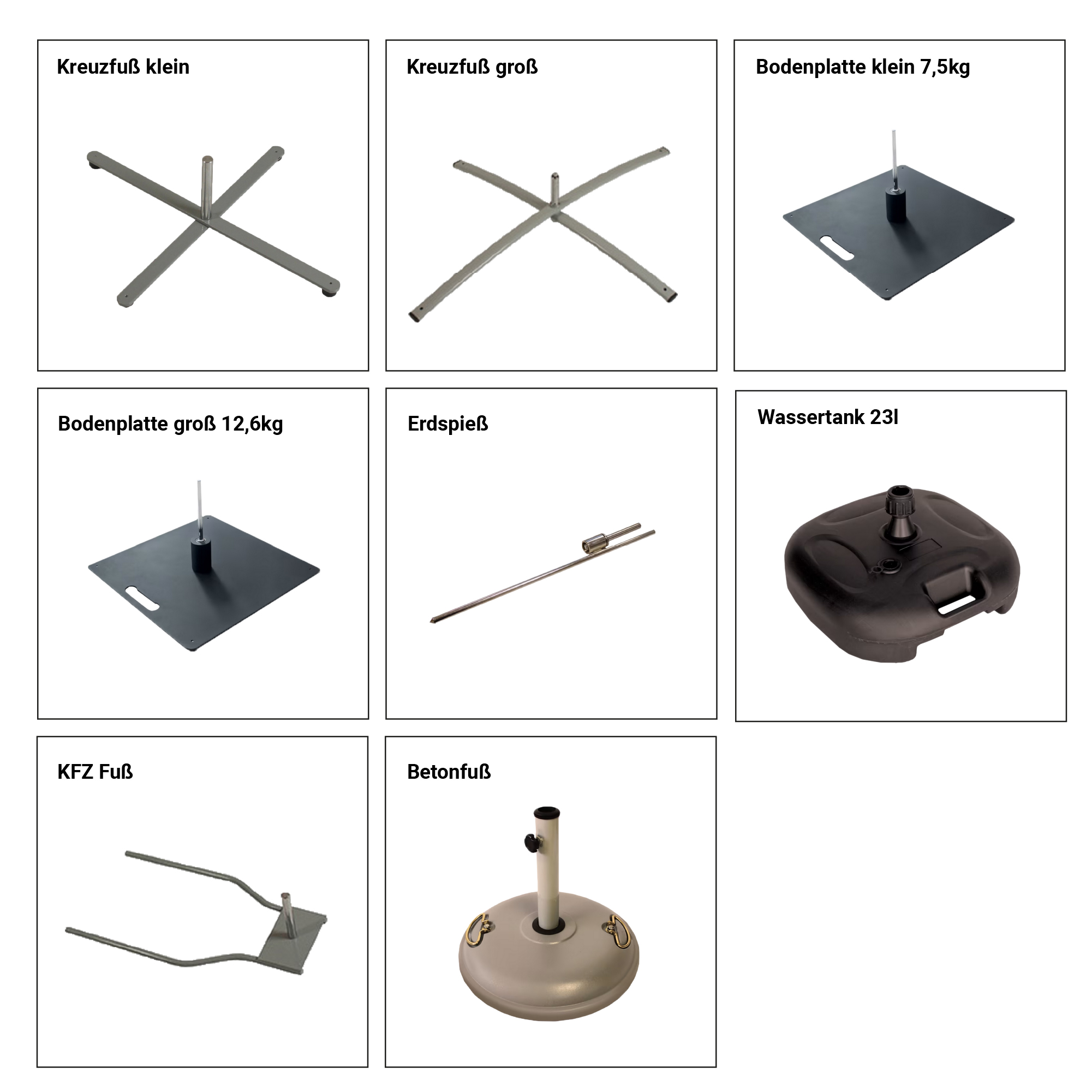 Für die Fahne sind zudem verschiedene Standfüße erhältlich, damit auf jedem Untergrund ein stabiler und sicherer Stand ermöglicht werden kann - egal ob Asphalt, Rasen, Sand oder Schnee. Soll die Fahne auf dem Boden stehen, so kann zwischen Kreuzfüßen, Bodenplatten, Wassertank, und KFZ-Fuß gewählt werden, mit einem Erdspieß hingegen kann die Fahne im Boden verankert werden. Um die optimale Standfestigkeit zu gewährleisten, kann bei der Verwendung eines Kreuzfußes oder einer Bodenplatte zusätzlich ein Wasserring zur Beschwerung verwendet werden.